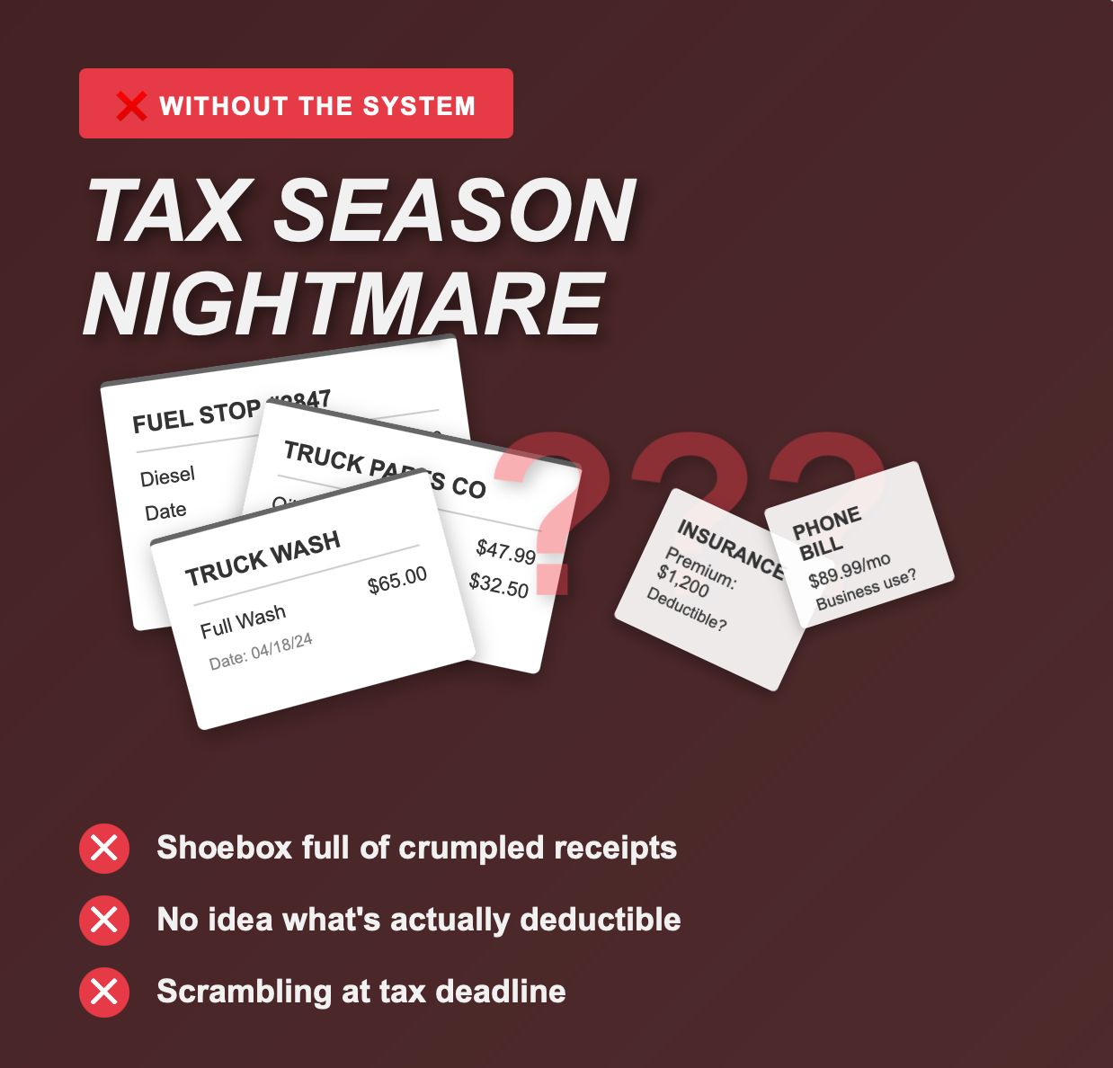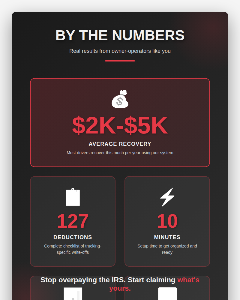 Educational Product Notice: This product provides educational information about IRS tax deductions and recordkeeping for owner-operators. It is not professional tax, legal, or financial advice.